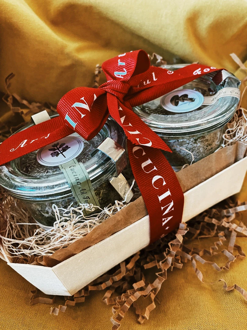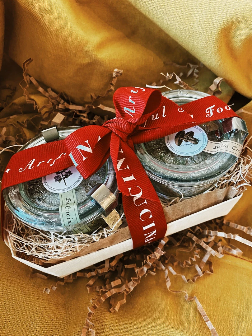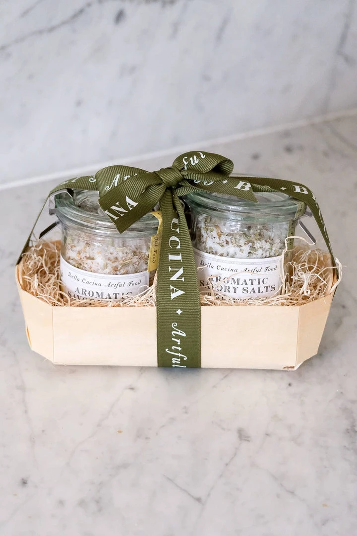 Includes one Rosemary and Lavender aromatic savory salt and one Porcini and Parsley aromatic savory salt.