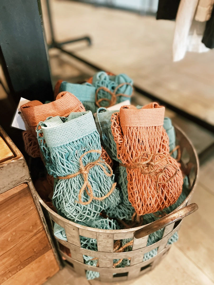 Lightweight and foldable, these totes can be easily kept in your purse or car. The expandable fabric allows it to adjust to the amount of storage needed. 18″W x 14″H. Expandable mesh netting. Cotton. Machine washable