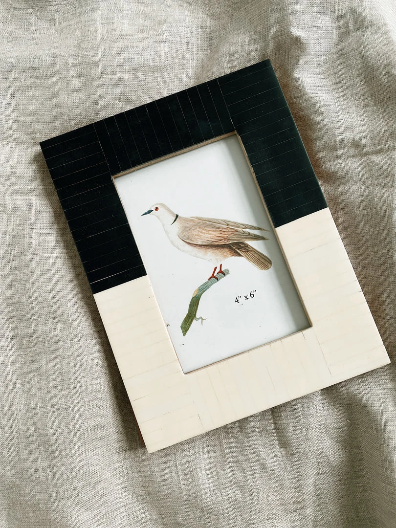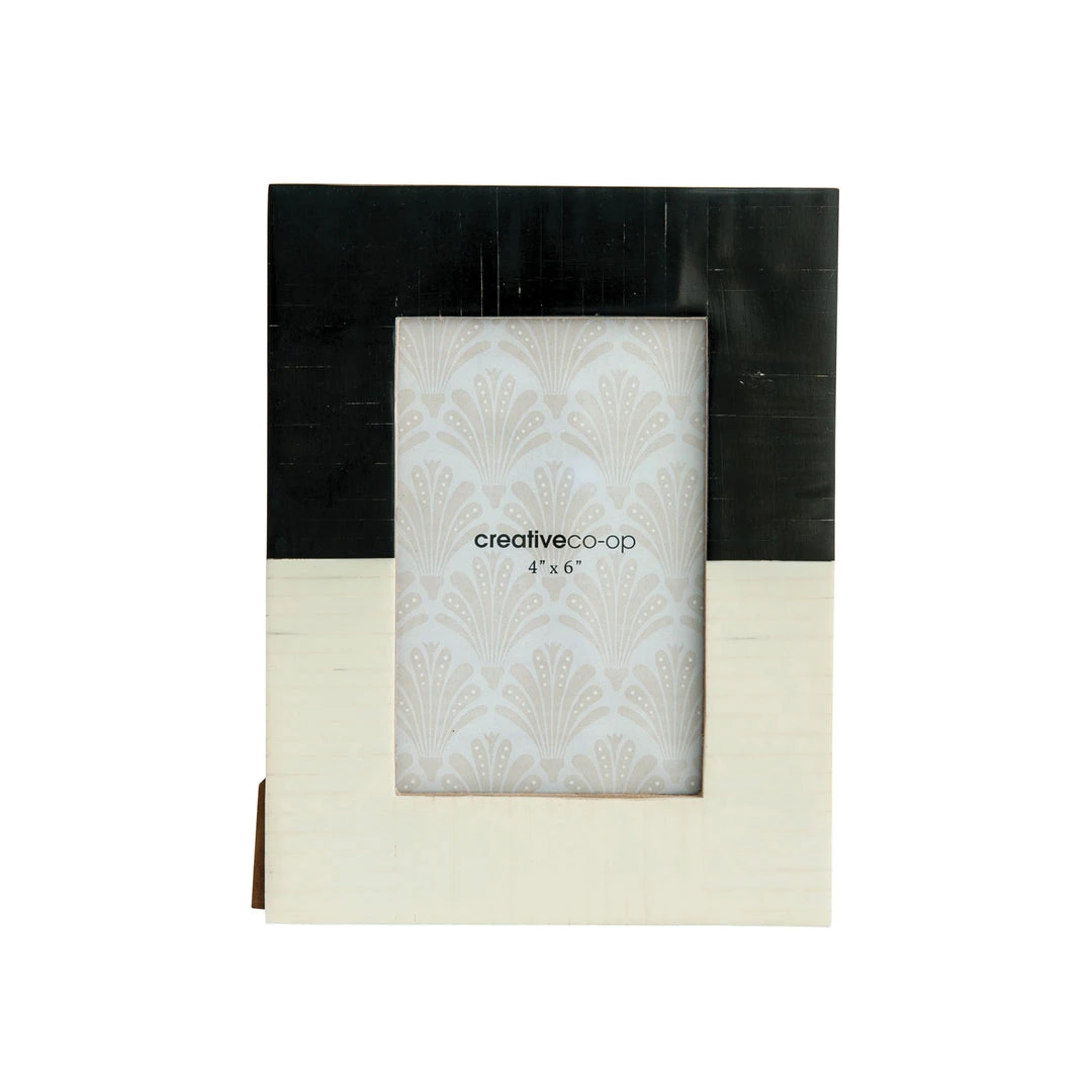 Striking black and white sides are displayed on this lightly distressed resin photo frame. Display a favorite photo or vintage black and white image on a shelf or tabletop. Great for a desk in the office or a room with a black and white decor.