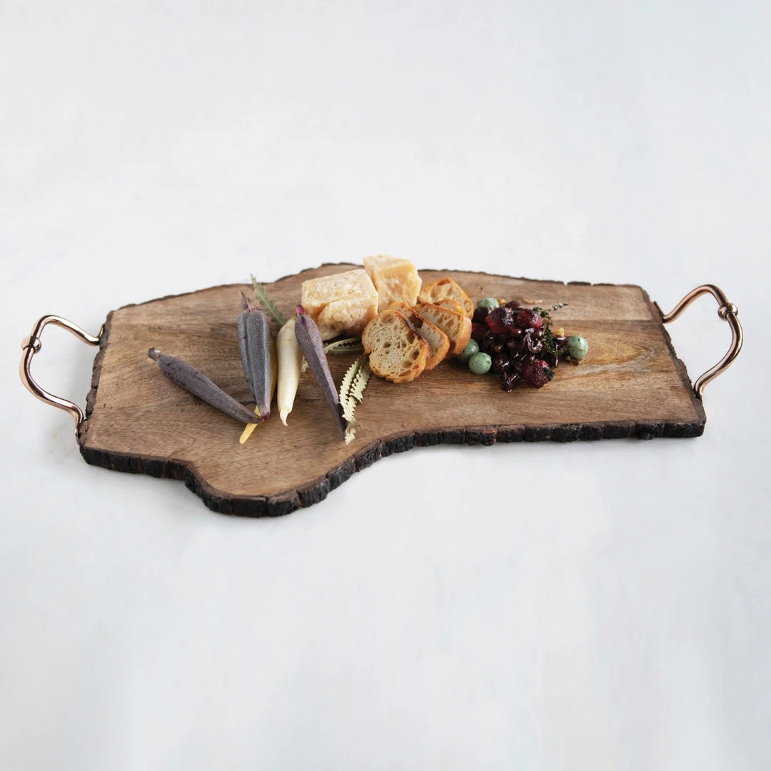 This uniquely shaped serving tray is the perfect piece for people that love hosting. With an asymmetrical shape, this tray is made out of mango wood and is perfect for serving cheese or meats in style.