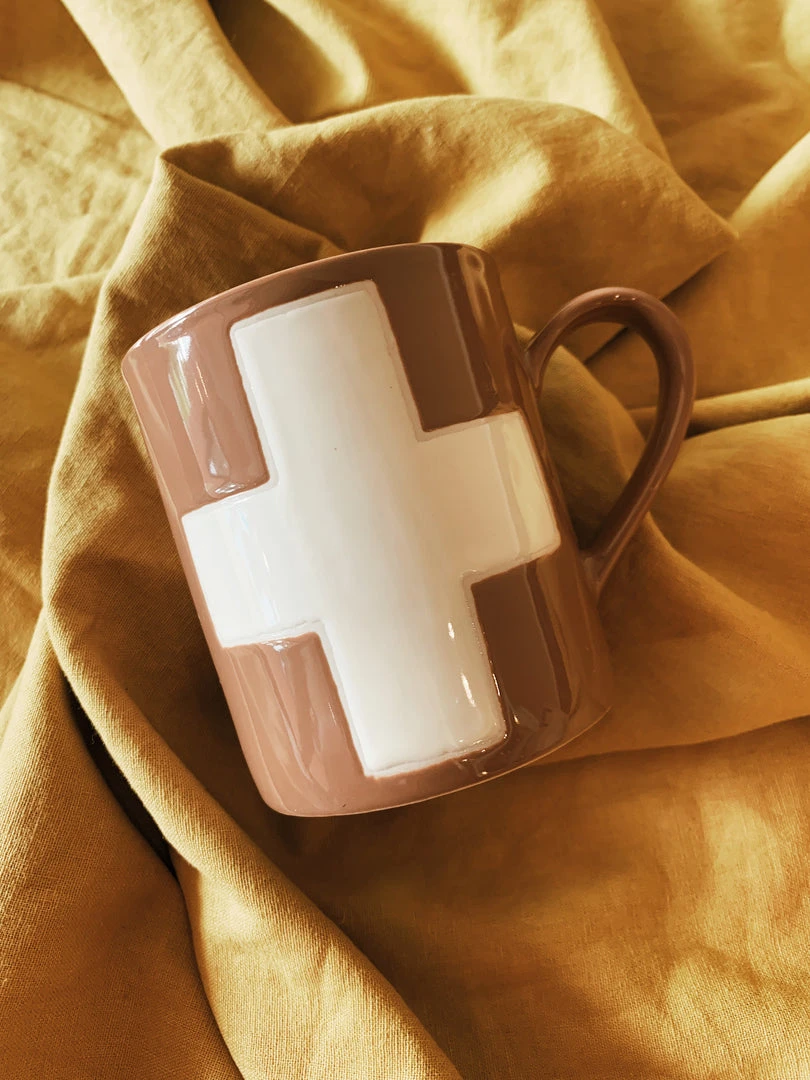 3″ Round x 4″H 8 oz. Handmade Stoneware Mug w/ Wax Relief Swiss Cross, 4 Colors (Each One Will Vary)