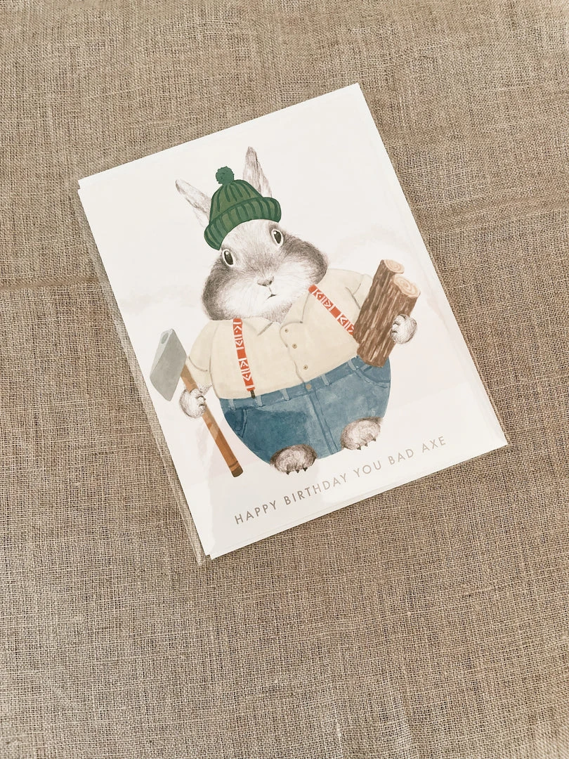 | A Lumberjack Bunny holding wood and an axe text reads “Happy Birthday You Bad Axe” |
