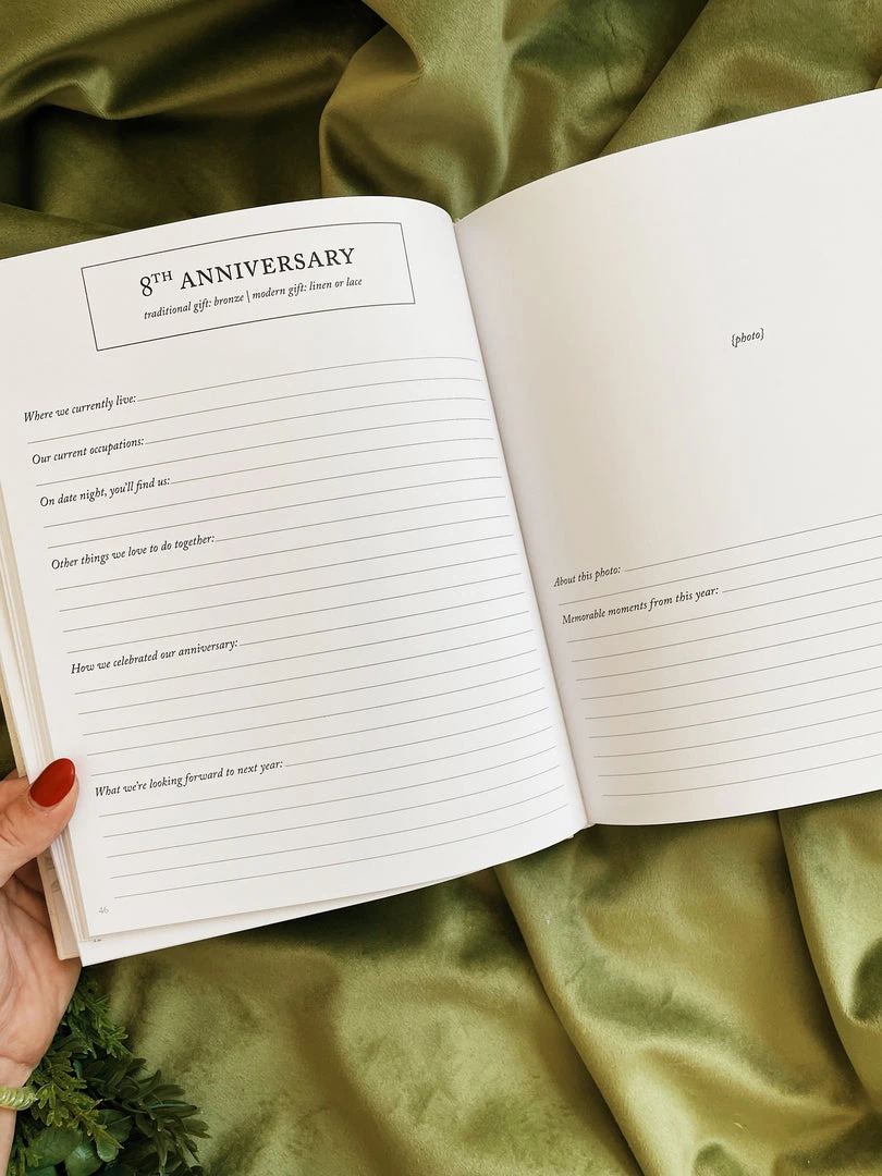- This keepsake book will help you capture a snapshot of your marriage memories that you will cherish for a lifetime. With simple, guided prompts and space for photos each year, you can watch your love story as it grows and share it with generations to come.