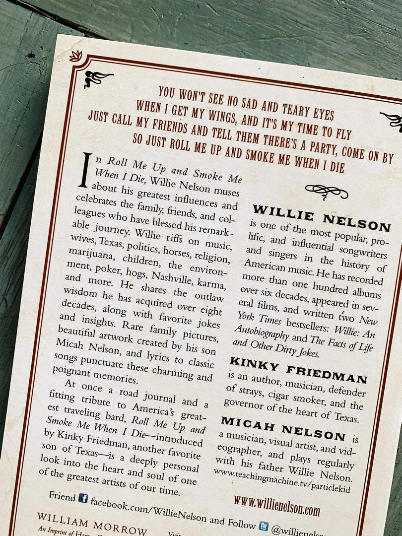 In Roll Me Up and Smoke Me When I Die, Willie Nelson muses about his greatest influences and the things that are most important to him, and celebrates the family, friends, and colleagues who have blessed his remarkable journey. Willie riffs on everything, from music to poker, Texas to Nashville, and more. He shares the outlaw wisdom he has acquired over the course of eight decades, along with favorite jokes and insights from family, bandmates, and close friends. Rare family pictures, beautiful artwork created by his son, Micah Nelson, and lyrics to classic songs punctuate these charming and poignant memories.