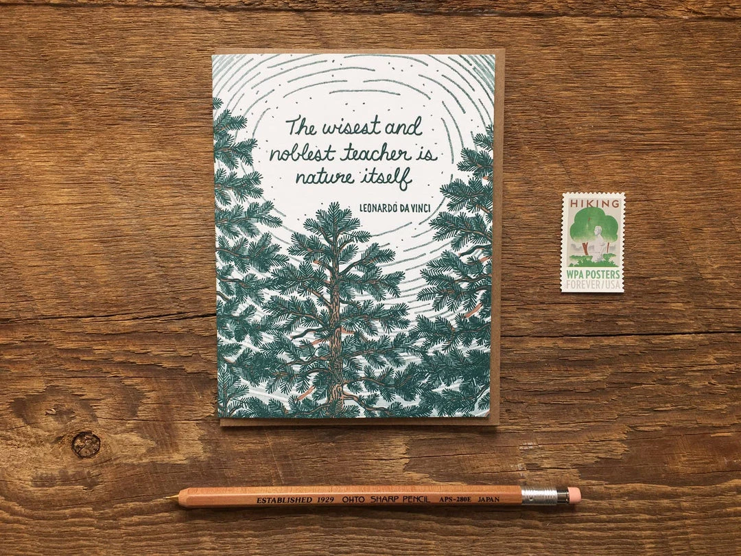 Card reads, “The wisest and noblest teacher is nature itself. – Leonardo Da Vinci”