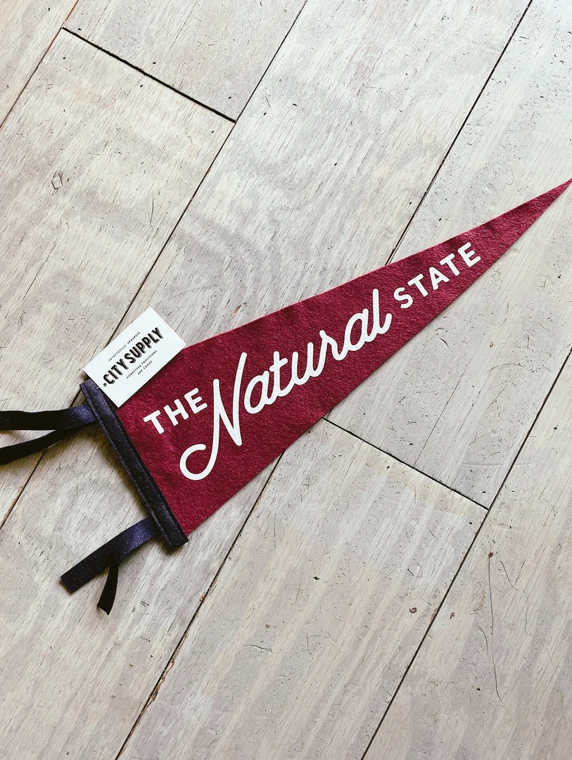 This pennant celebrates Arkansas and all of its outdoor spaces from the Ozark mountains to the Delta. It would look perfect in dorm rooms, bedrooms, offices, bulletin boards, or just about any wall you can think of. It won’t disappoint.Â