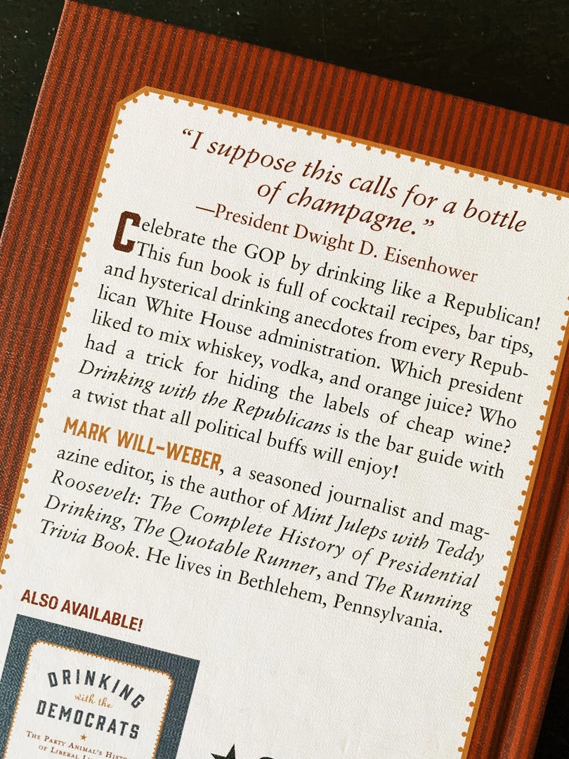 Learn how to drink like a Republican! Organized by GOP president, this fun gift book is full of cocktail recipes, bar tips, and hysterical drinking anecdotes from all Republican White House administrations. Which president liked to mix whiskey, vodka, and orange juice? Who had a trick for hiding the labels of cheap wine? Drinking with the Republicans is the bar guide with a twist that all political buffs will enjoy!