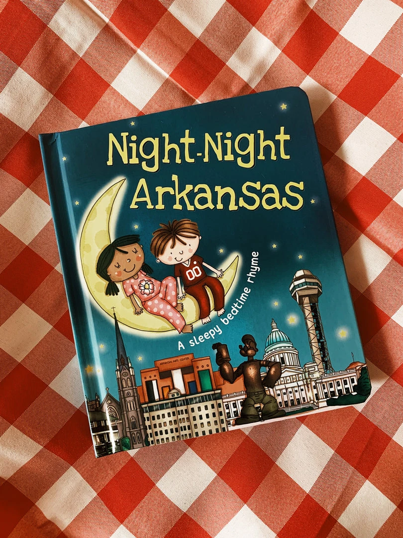 It’s bedtime in Arkansas! Say goodnight to all your favorite locations, including: Arkansas State Capitol, MacArthur Park, Hot Springs, Mountain Tower, Ozark Excursion Train, Pea Ridge National Military Park, Cathedral of St. Andrew, Arkansas Arts Center, Little Rock Zoo, University of Arkansas Razorback Stadium, and the  Museum of Discovery.