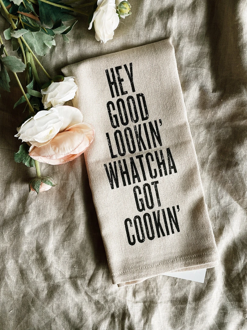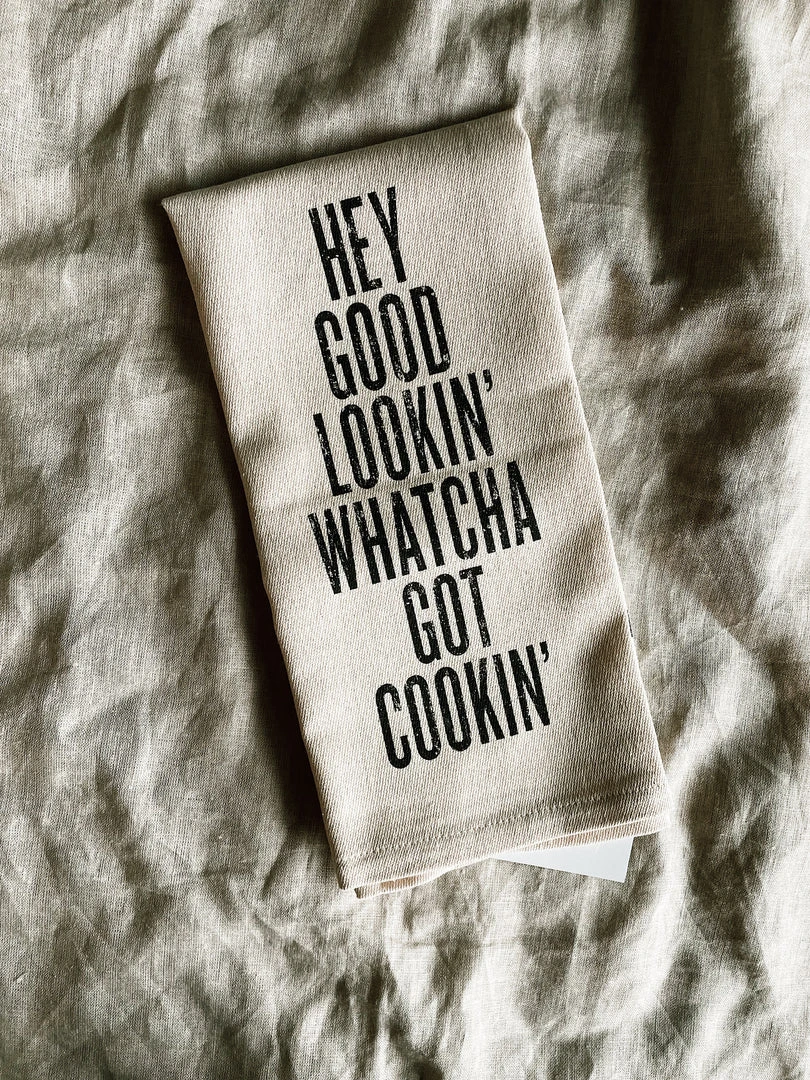 Hey Good Lookin’ Whatcha Got Cookin’ – Kitchen Towel Arguably, the song of southern kitchens everywhere. Distressed black ink surrounded by a pattern of the timeless cast-iron skillets.