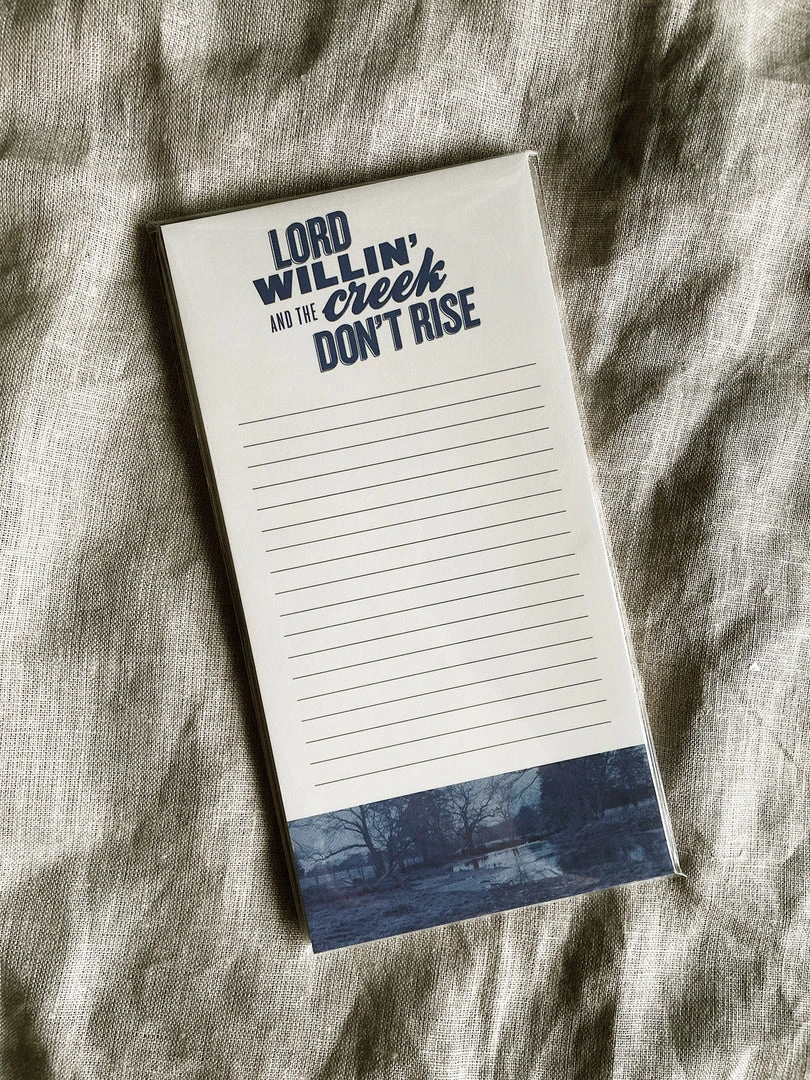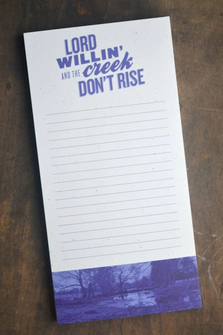 Lord willin and the creek don’t rise. Our notepads are perfect for making lists, writing ideas and reminders. 50 sheet pad. Full color offset printing. FSC certified cream speckletone stock.