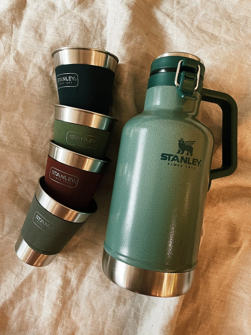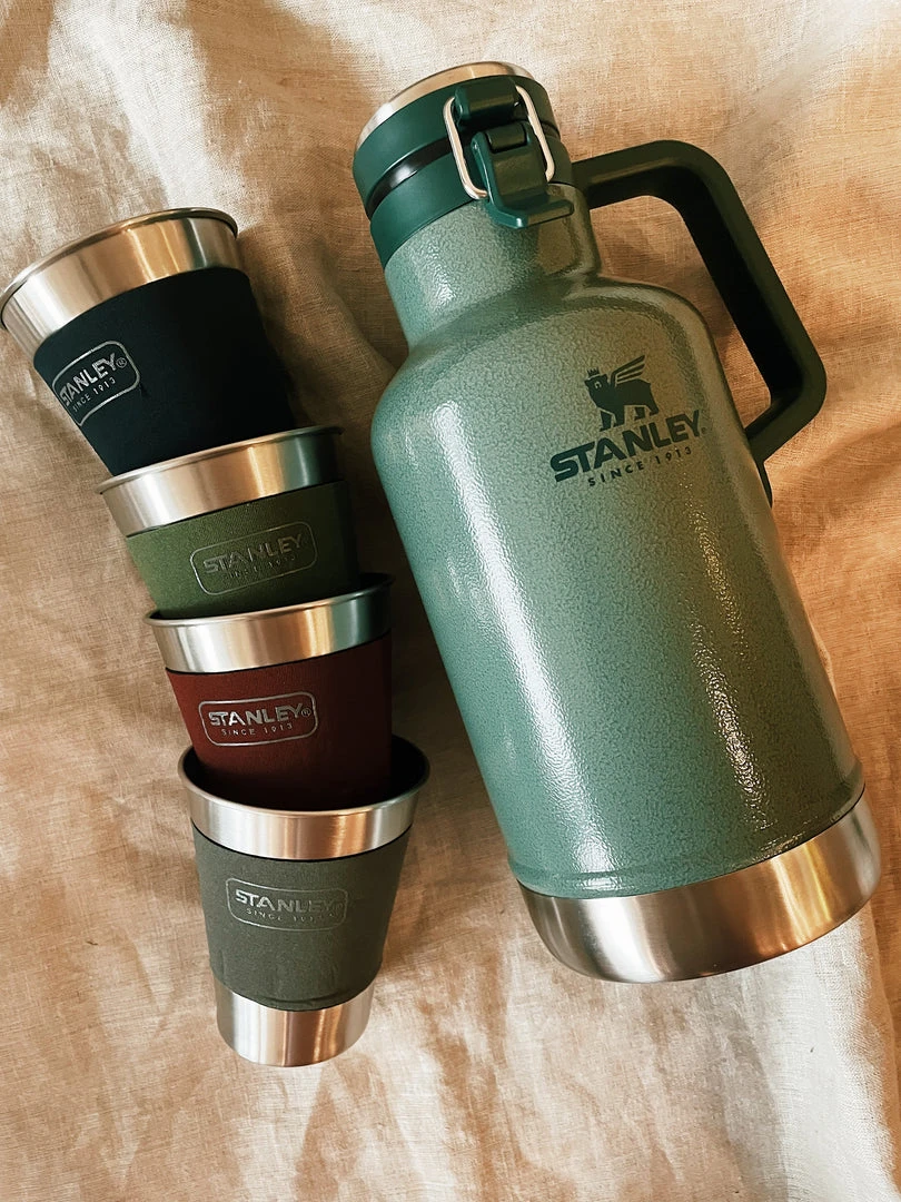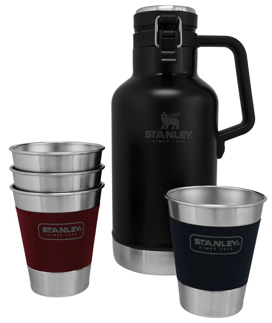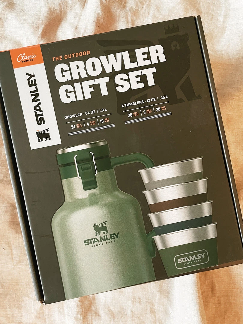 - Classic easy-pour growler + 4 stacking steel tumblersÂ