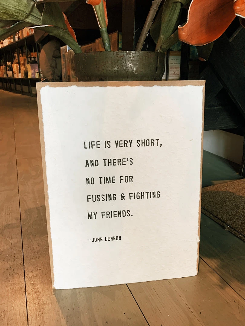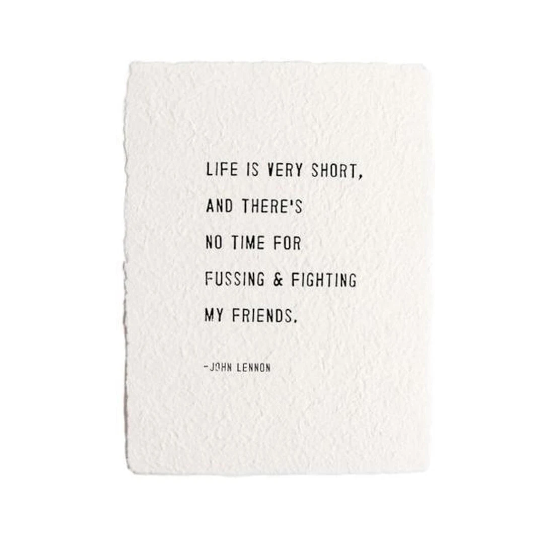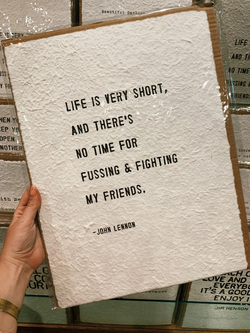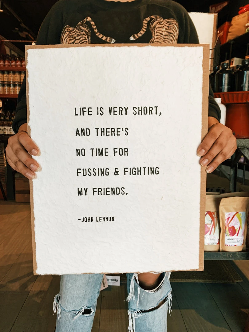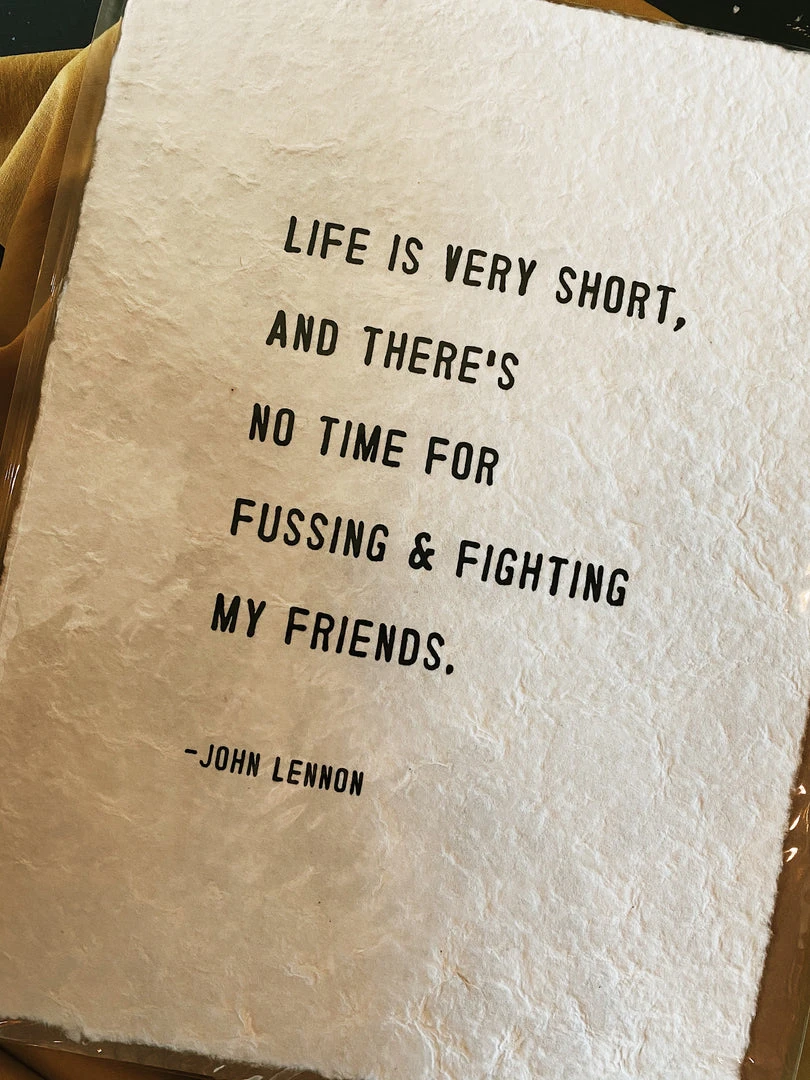 Print reads, “Life is very short, and there’s no time for fussing and fighting my friends. – John Lennon”
