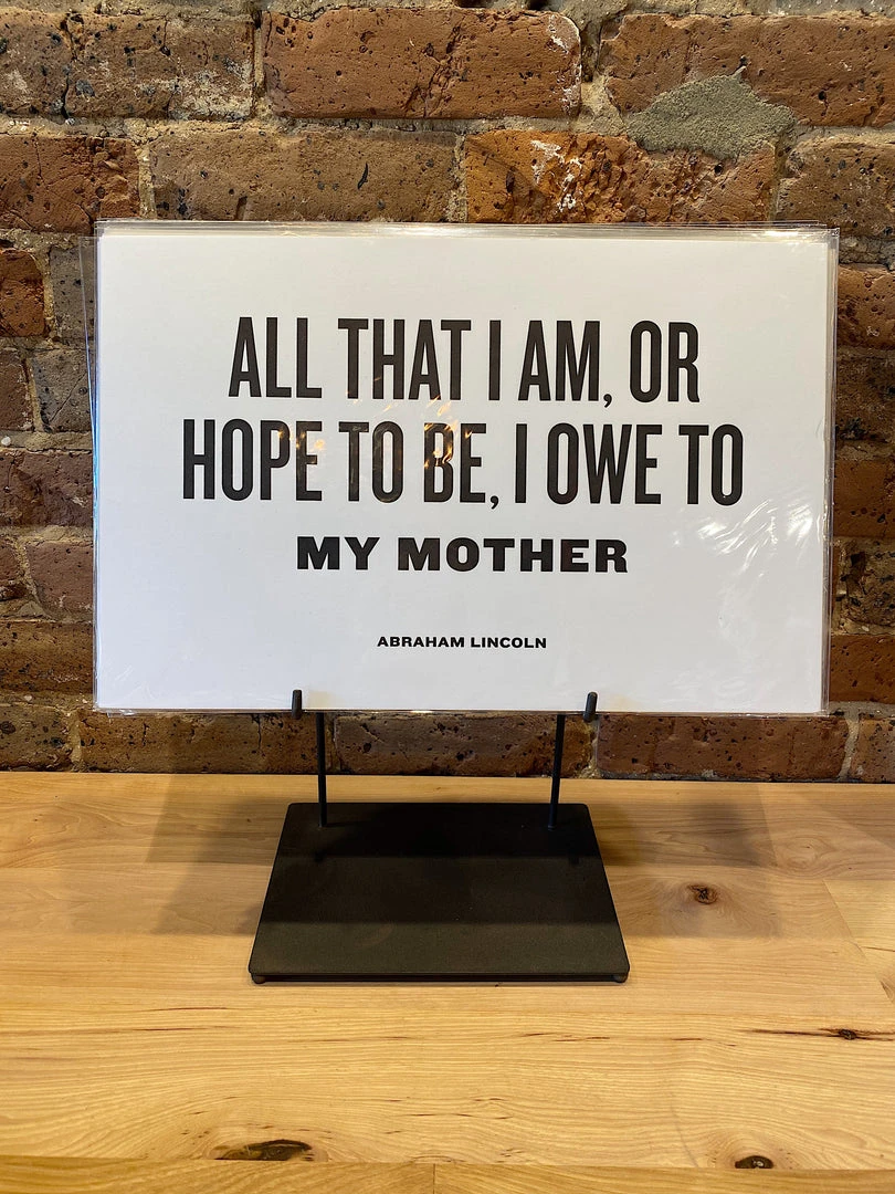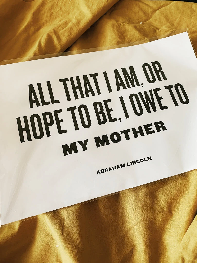 Quote reads, “All that I am. Or hope to be, I owe to my mother.” A quote from the 16th President of the United States, Abraham Lincoln.