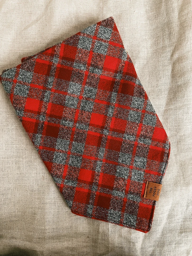 For the dapper pup. This classic gray and red plaid scarf is made from luxuriously thick flannel that’s as soft as a cloud.