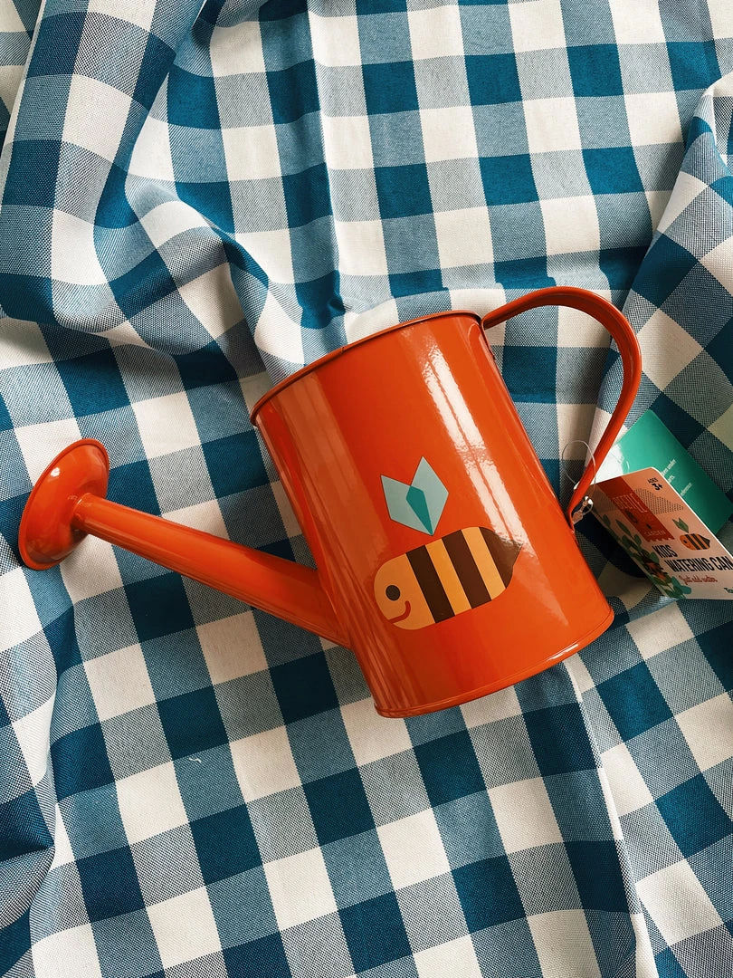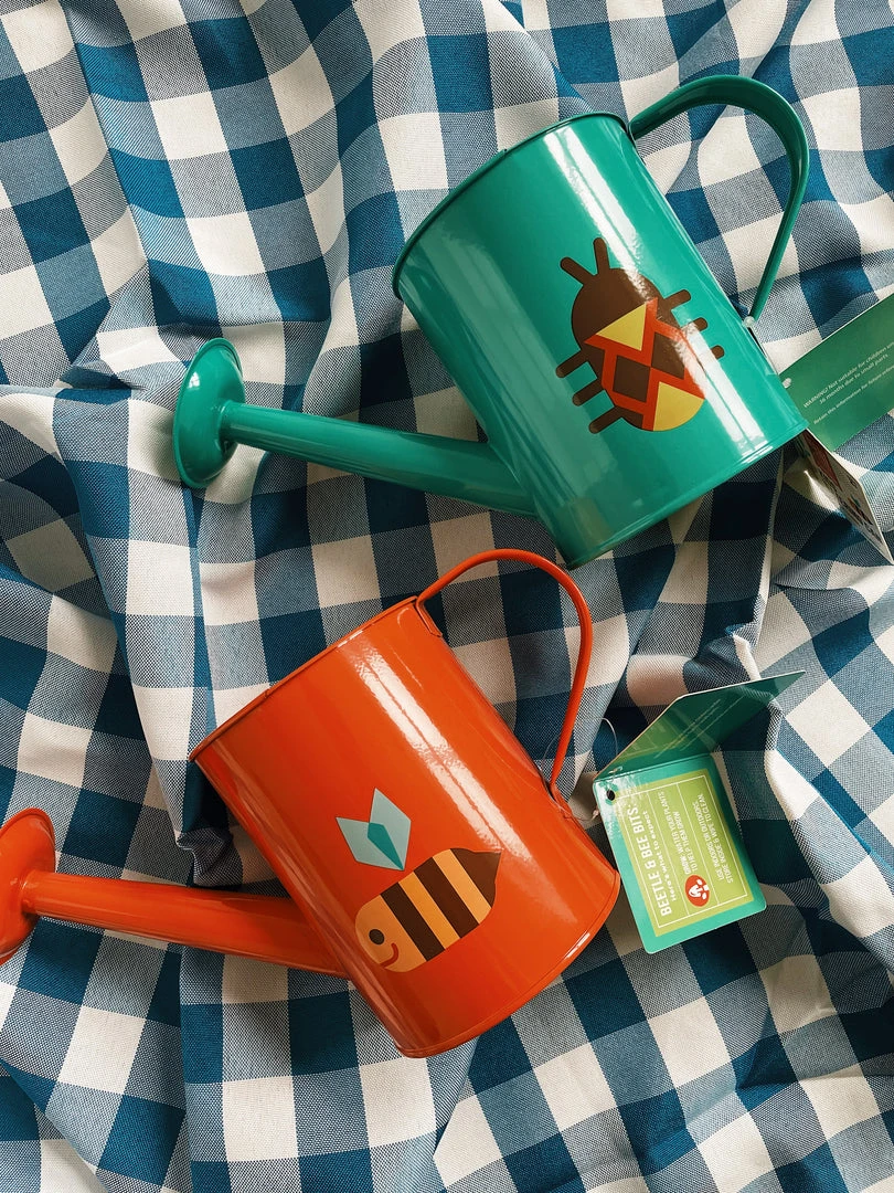 These colorful 5½” tall metal watering cans come in an assortment of orange-red and teal with adorable character art.